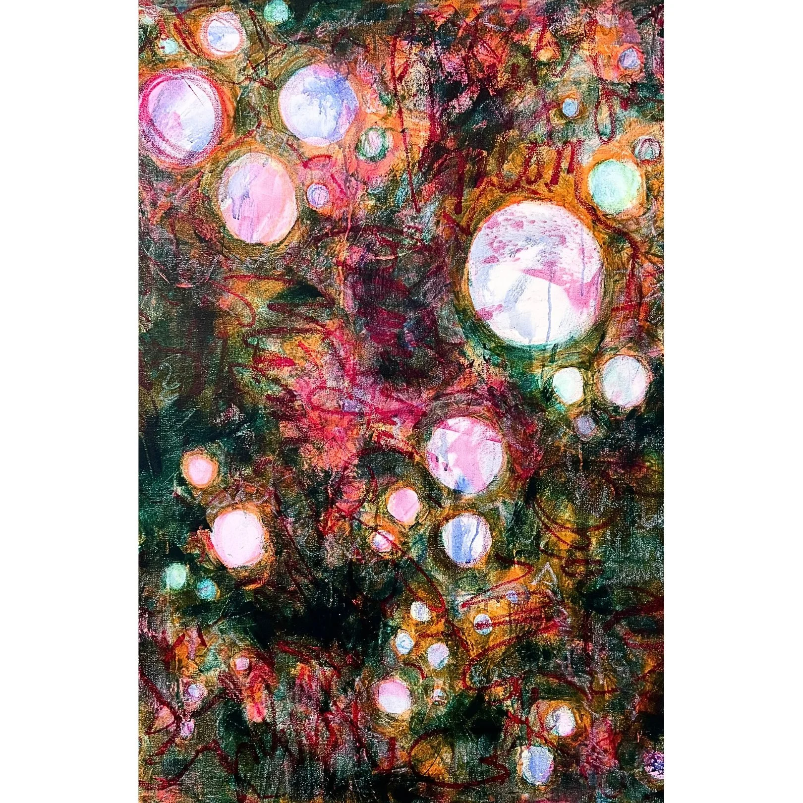 The underlying automatic writing, sacred geometry symbols and misty whitewash represent many of the visual prompts I receive during meditation. They present a fitting ground for the spontaneous grid work to emerge above it.